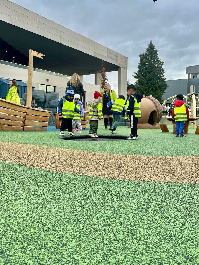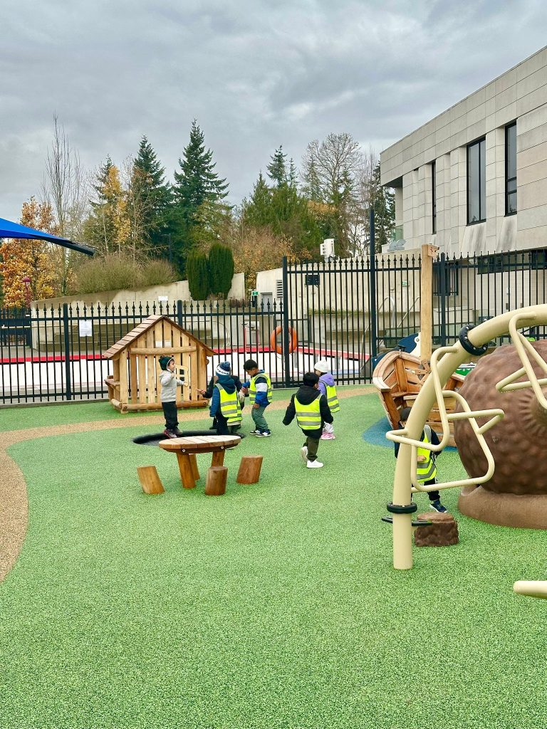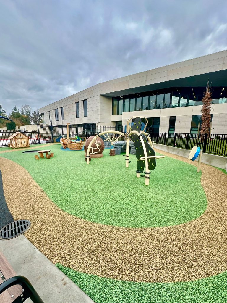 The previous playground supported roughly 18 children at a time within a footprint of 1,188 square feet, with only limited accessibility. The new design increases the play space nearly threefold, expanding to approximately 3,484 square feet and accommodating up to 54 children.